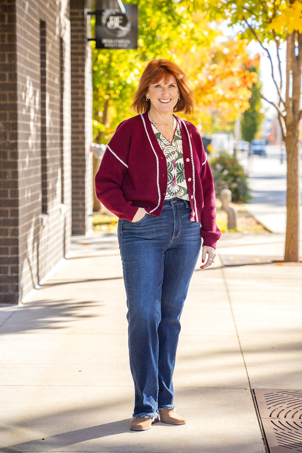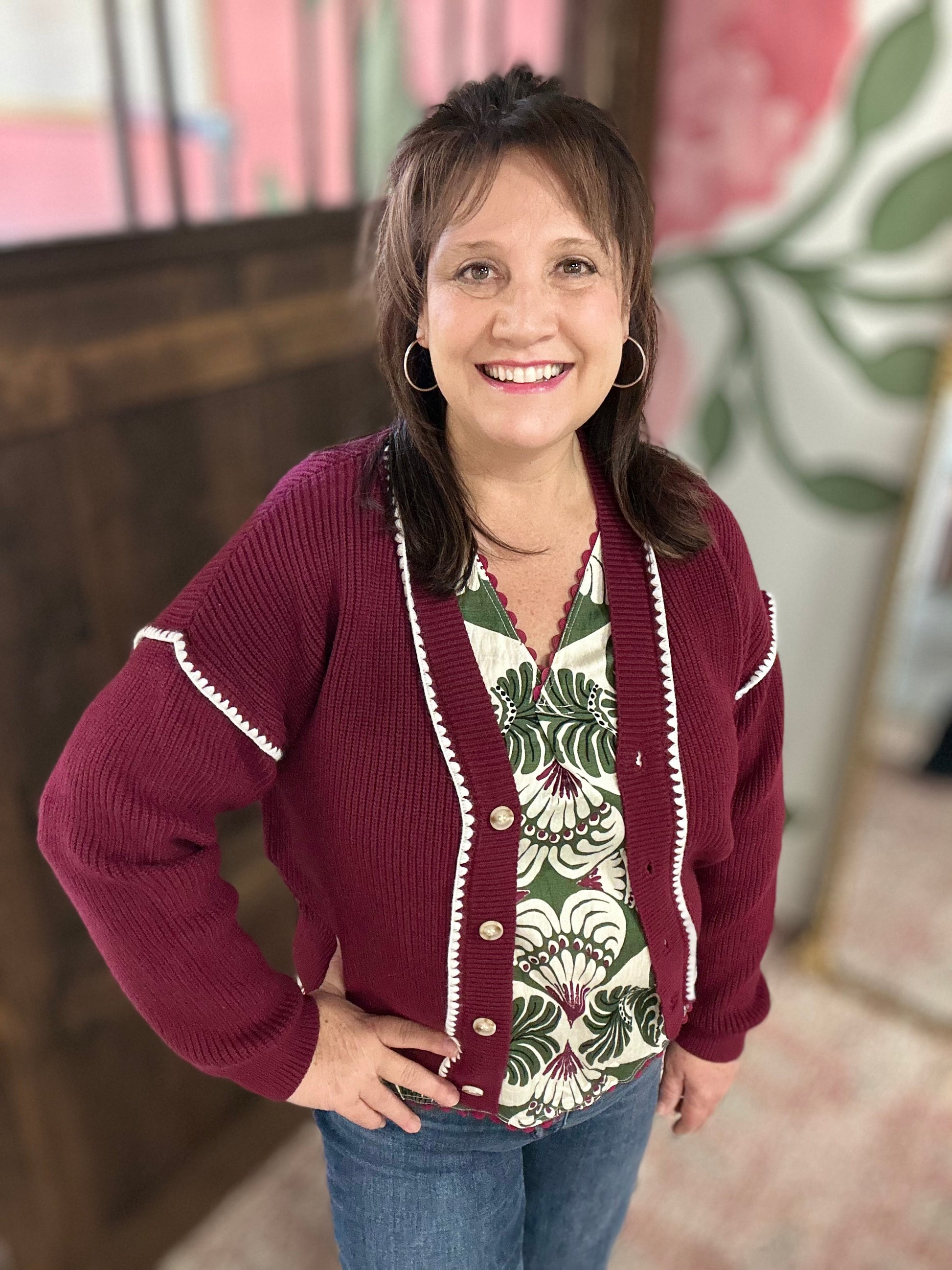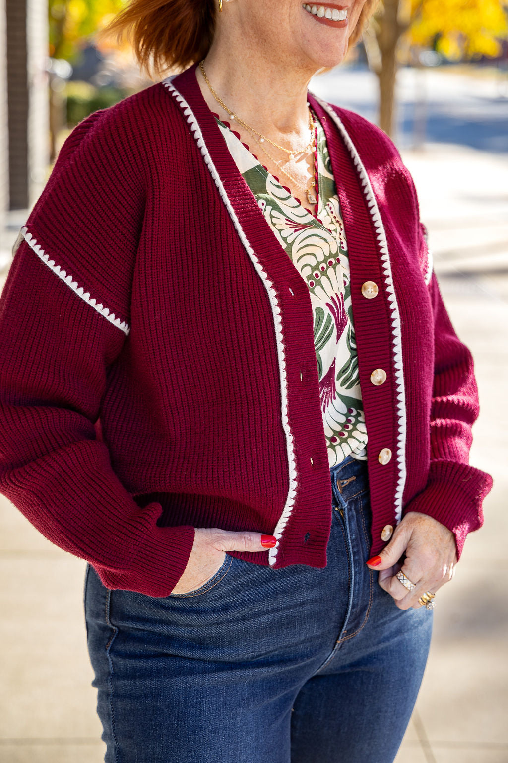 Expertly crafted with a longer crop fit, this burgundy cardigan features a stylish white stitch trim and button down detail. Stay cozy and fashionable all day in this versatile piece.
