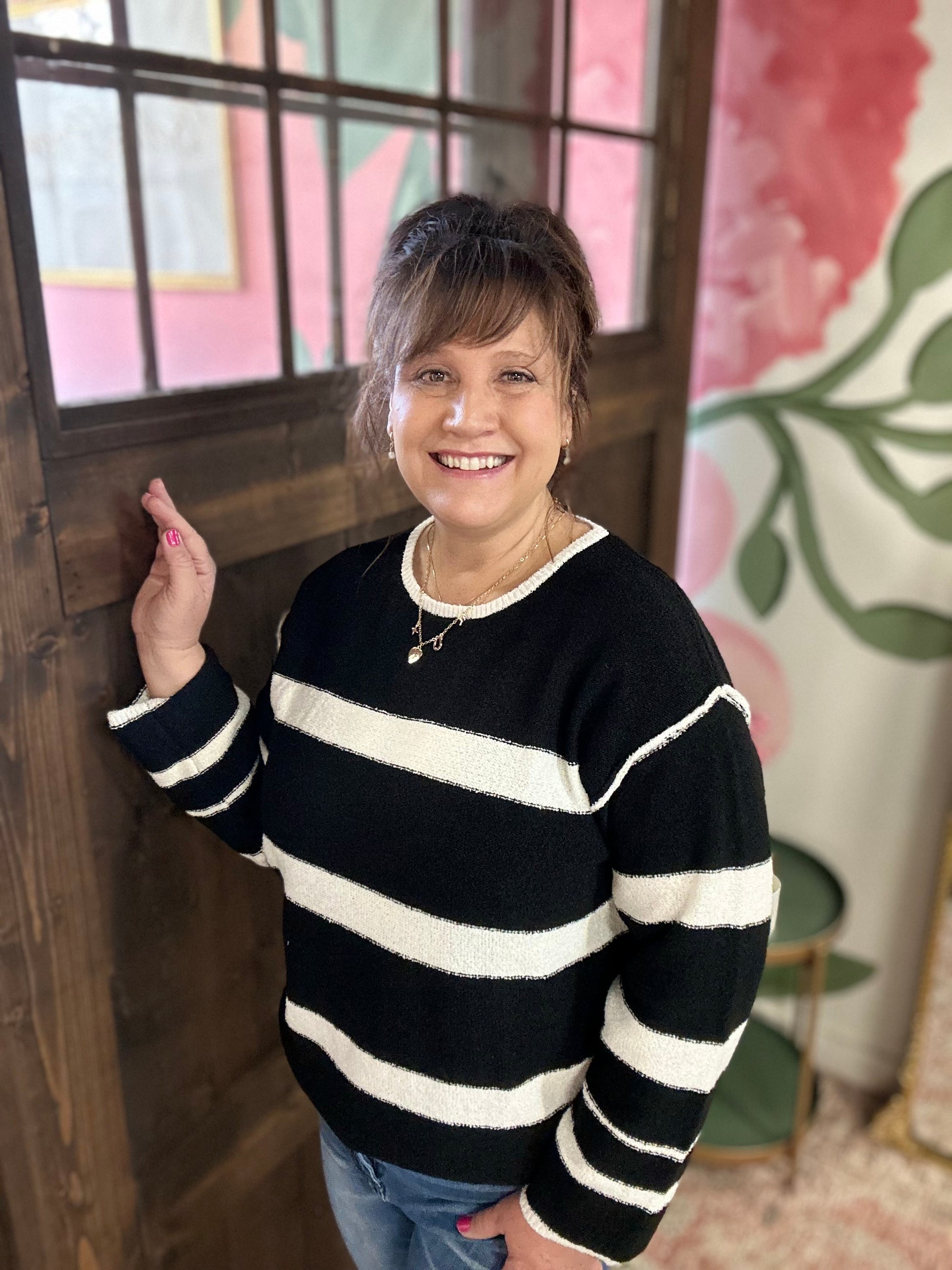 Stay warm and cozy with our Carolyn Crew Neck Black White Striped Sweater. Dress it up with a skirt and booties or keep it casual with your favorite denim.