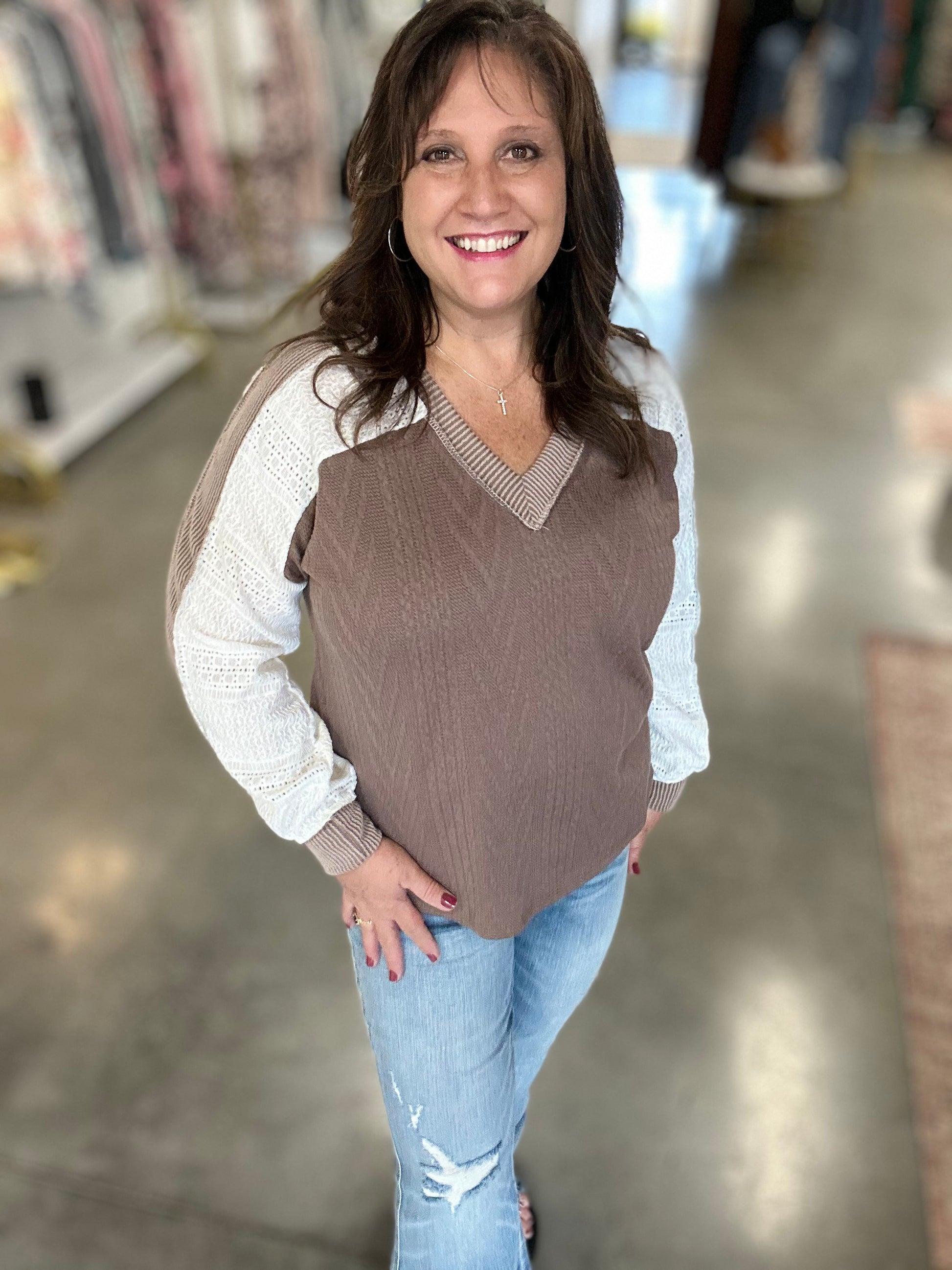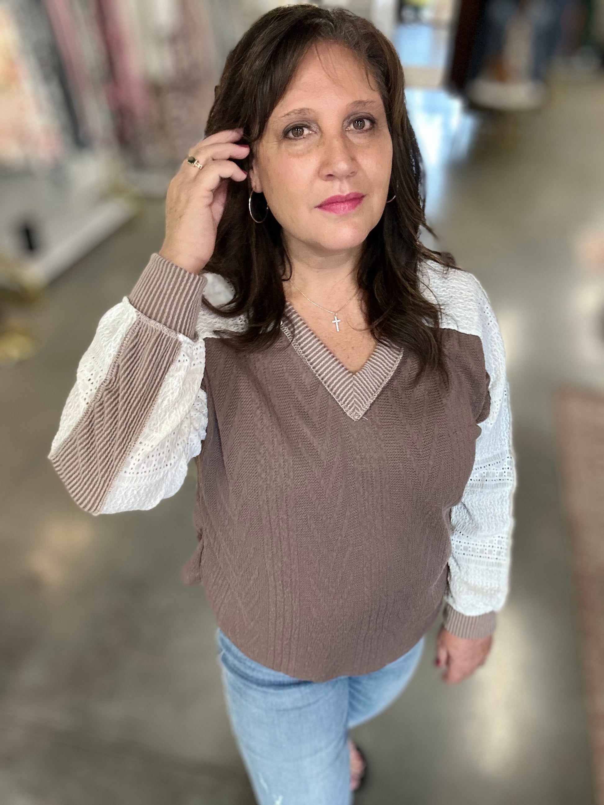This Grace In Layers Cable Knit Top is a must-have for your wardrobe. Made of high-quality poly span material, it features a banded v-neck line and long sleeves with elegant lace detail. The cable knit design adds a touch of sophistication to any outfit. Stay cozy and stylish with this top in mushroom color.