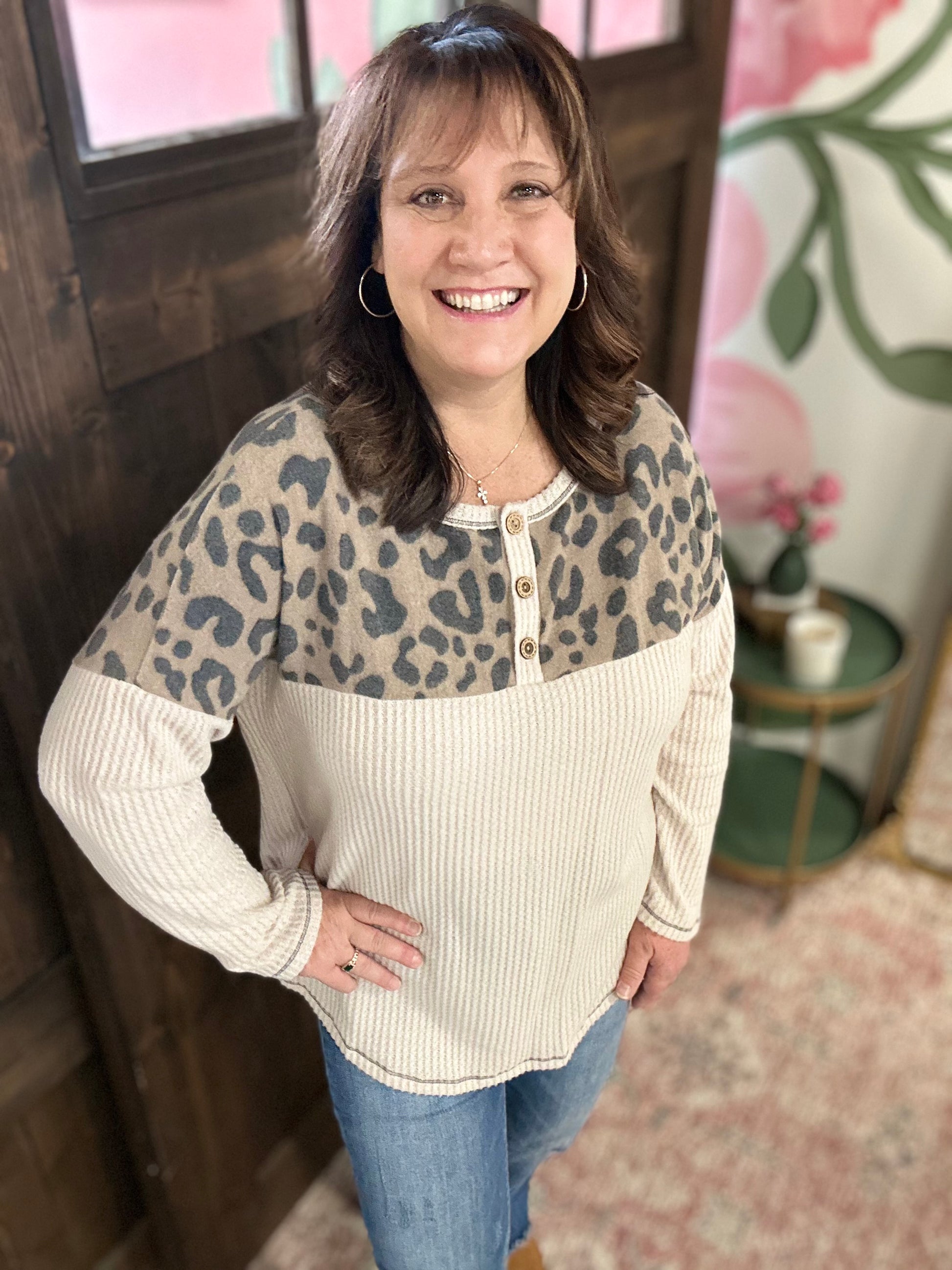 Oatmeal Waffle Leopard Print Top